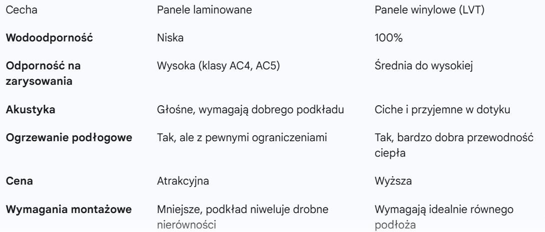 Panele winylowe, często oznaczane jako LVT (Luxury Vinyl Tiles), to nowsze rozwiązanie, które zyskuje na popularności. Ich największą zaletą jest pełna wodoodporność. Możesz je położyć nawet w łazience, a rozlane płyny nie będą stanowić dla nich problemu. Są też znacznie cichsze od laminatów, co zwiększa komfort akustyczny w domu. Co więcej, są ciepłe w dotyku i idealnie nadają się do montażu na ogrzewaniu podłogowym, ponieważ dobrze przewodzą ciepło.